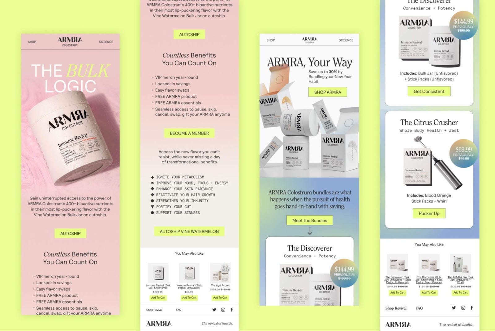 ARMRA built its brand around a single hero ingredient (colostrum) but gradually expanded with format variations (stick packs for convenience) and flavors (Blood Orange, Watermelon) to improve the user experience. In 2023, it launched Performance Revival, targeting athletes with added functional ingredients.