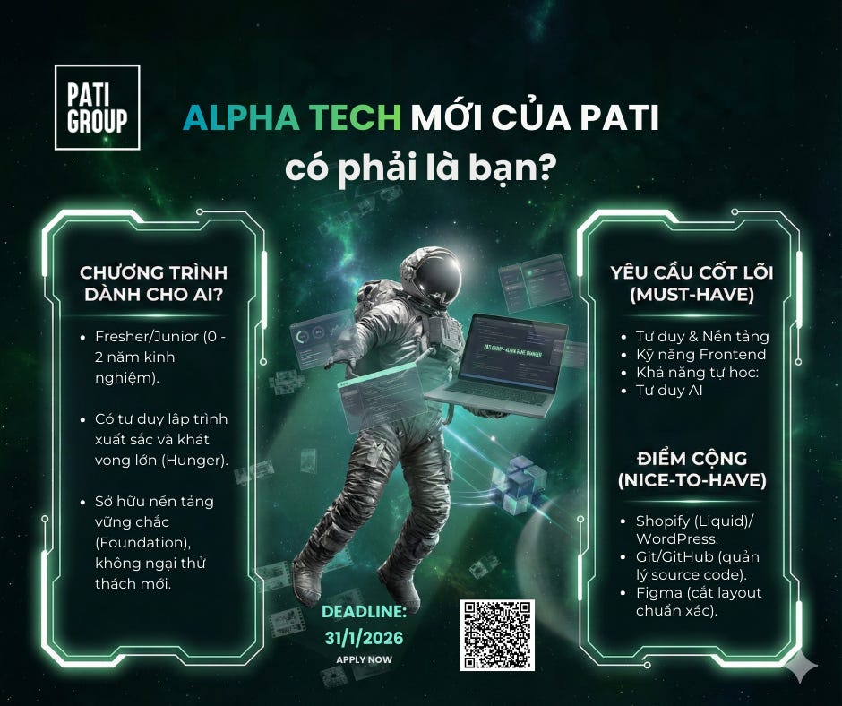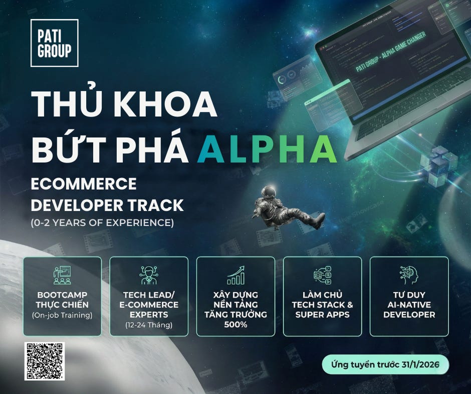 Alpha - eCommerce Developer Track không phải là một vị trí tuyển dụng thông thường. Đây là một Bootcamp thực chiến (On-job Training) được thiết kế riêng để biến những ứng viên có tố chất tốt nhất (nhưng chưa nhiều kinh nghiệm) trở thành những Tech Lead/E-commerce Experts chỉ trong 12-24 tháng. Bạn sẽ tham gia vào đội ngũ xây dựng nền tảng công nghệ cho doanh nghiệp tăng trưởng 500%/năm tại thị trường Mỹ.