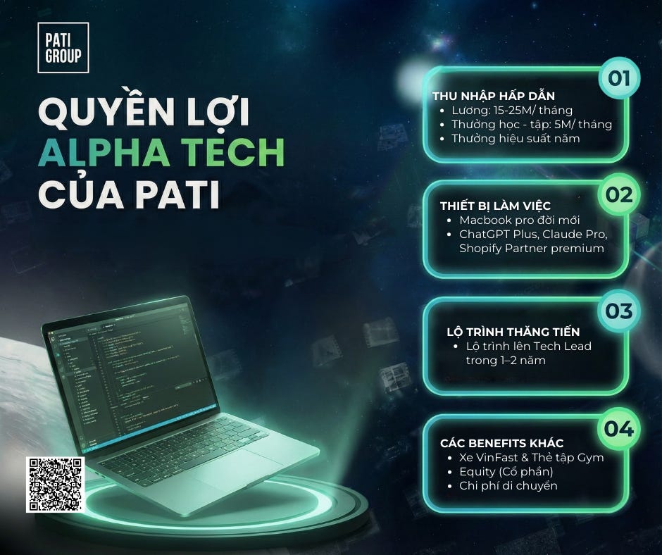 Chào mừng bạn gia nhập biệt đội Alpha. Set up tài khoản và bắt đầu hành trình phát triển cùng PATI Group & nhận Macbook sau khi hoàn pass probation (nếu có nhu cầu).